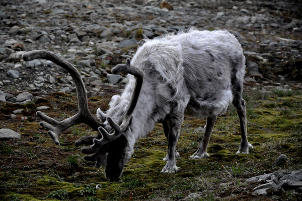 以在北京动物园看大型鹿科动物换毛的经验看,如果从去年7月21日照片所显示的样子变成今年7月27日看到的样子,起码需要10天以上!可惜的是,去年7月27日,我正好在与朗伊尔宾同样纬度的岛屿东侧接近过一群驯鹿,但很可惜的是,让另一伙人给追到很远的山里去了,以至于我没有一张同一天的照片,那群鹿是非常有可能披着一身“破老羊皮袄”的!