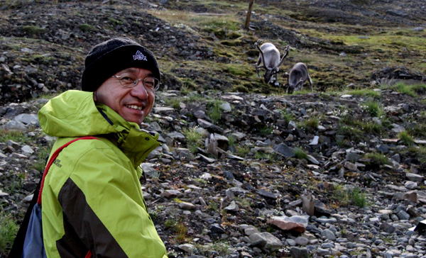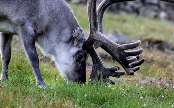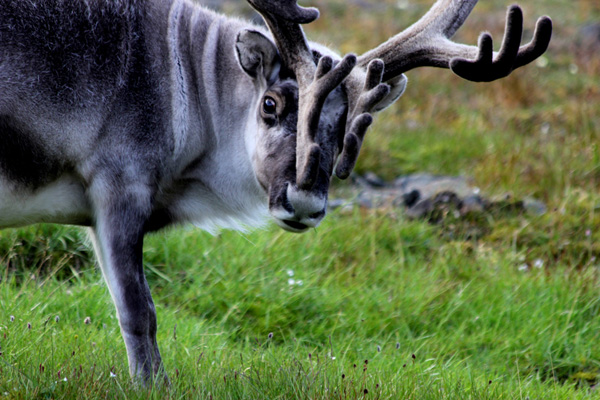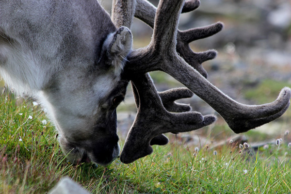 好在,我是那种“没心没肺”达到了一定水平的人,从不为那种永远得不到或永远已失去的东西而捶胸顿足,惋惜一阵也就过去了,马上又沉浸在“有动物看有糖吃”的欢乐中去了。果然,“老相识”的感觉真好,我仍旧是去年的做法,找个地方坐下来,也不摄影,就是那么呆呆地看,呆呆地看。果然,驯鹿夫妇对我好像也有“老相识”之感,居然从我的脚前走了过去,在我身体的斜前方静静地站定下来,我目测了以下,不到2米远,雌鹿嚼着长得比往年都高的禾本科植物,大雄鹿表演般地在草地上蹭着覆满绒毛的新角给我看,清晨的极地阳光洒在身上,草坪上,伊甸园般的恬静。