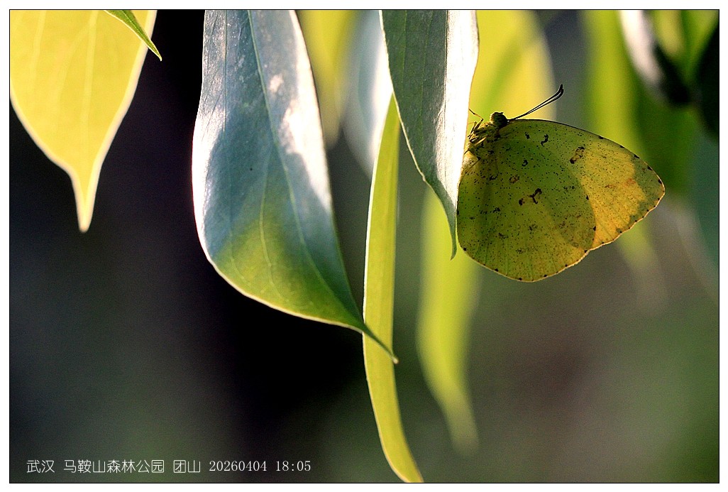 日落前,发现一只黄粉蝶准备在一株不太高的香樟树叶子背后睡觉。这个时间段的蝴蝶,几乎不会再飞动,可以长时间随便拍。