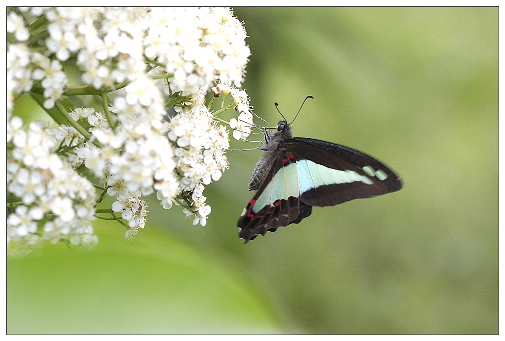 森林公园有一株盛开的石楠树,吸引了不少青凤蝶前来聚餐。