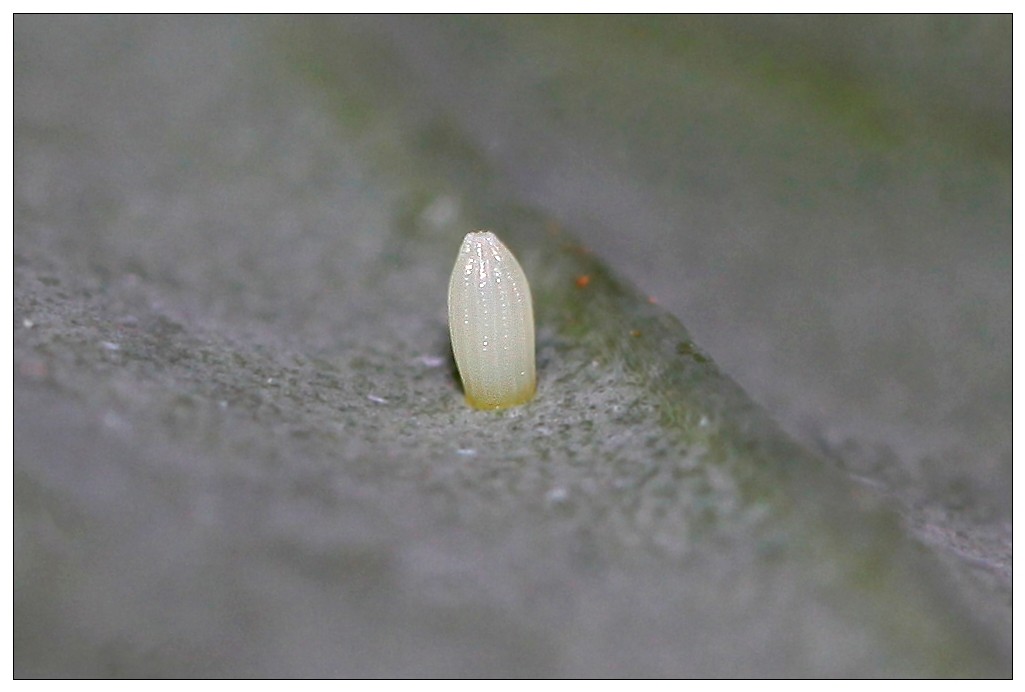 菜粉蝶的卵,是看着她在油菜叶子背面产卵之后拍的。