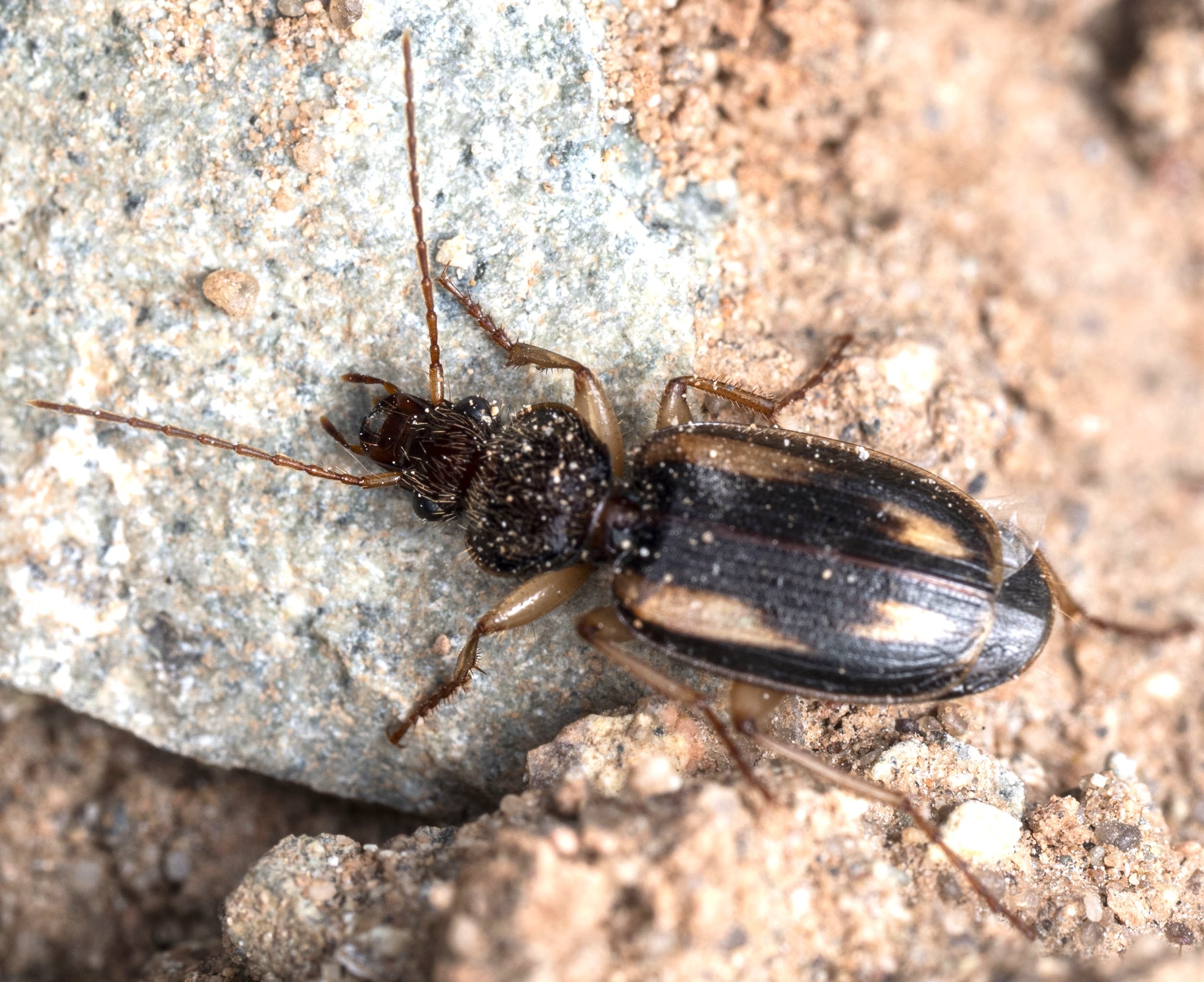 此外,在水库岸边近水处,我还发现了一些小型步甲、跳蝽和蠼螋。由于温度较低,它们趴在沙子上一动不动,用吸管很容易捕获。