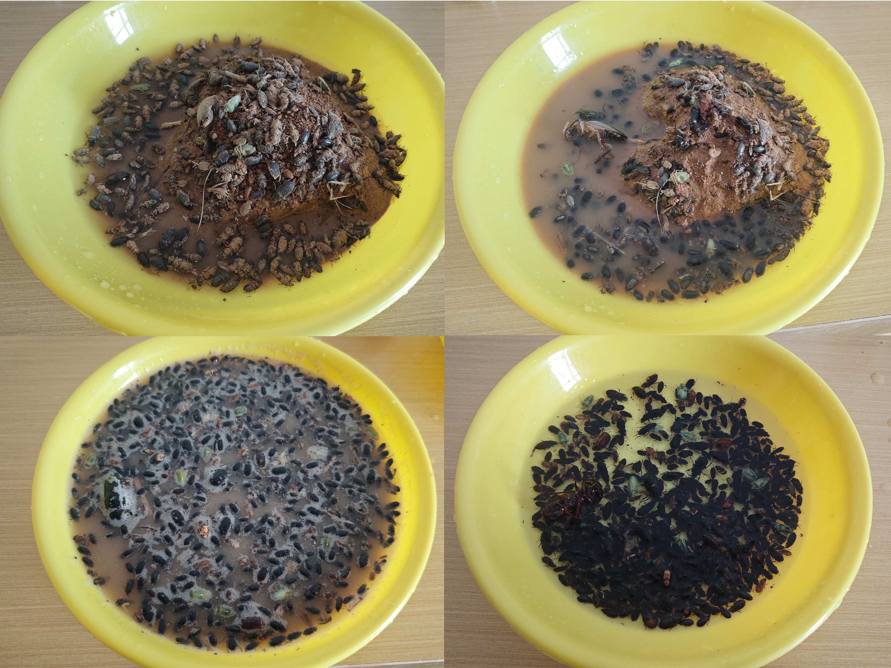 当灯诱而来的步甲数量较多时,队员张能亮出了他的特制工具——改装版小型吸尘器,快速吸食地上的步甲,然后倒入大毒瓶内熏杀,此法高效、便捷、省力,唯有一憾:不论操作多小心,难免会吸进一些尘土和小石粒。吸尘器采集的标本经过熏杀过夜后,倒入盘中,加入自来水,将漂浮的昆虫捞到另一个空盘里,再加水漂洗2-3次,最后用酒精冲洗一遍,虫体就能基本清理干净,随后便可装瓶保存(图8)。
