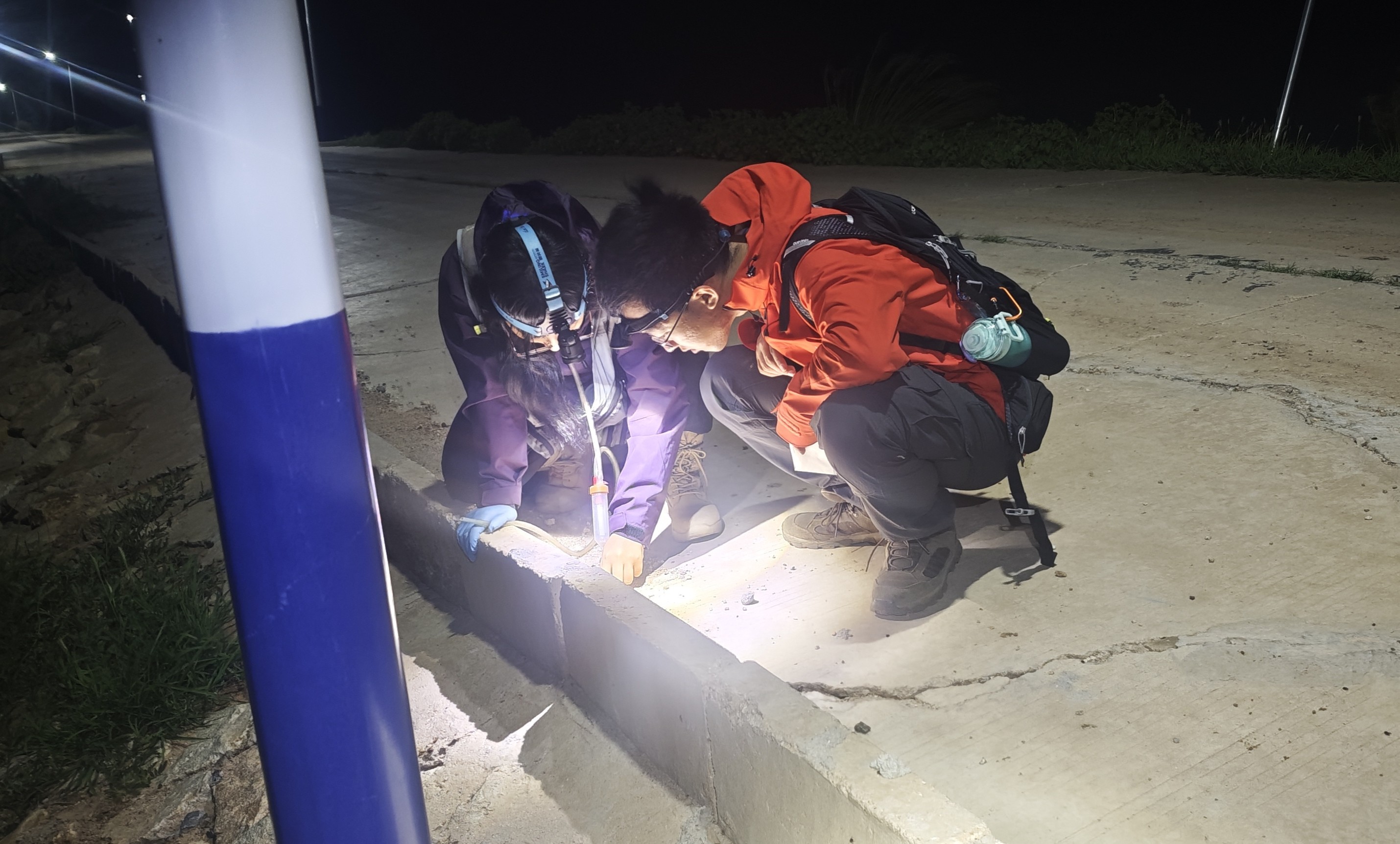 更为奇怪的是,仔细观看灯下的大坝水泥地面,能看到许多跳虫爬来爬去,它们体长只有1毫米左右,不仔细看很难发现。我赶紧叫来抓跳虫的队员,用吸管捕捉了了一个多小时(图11),足足收获了上百头。这是一个新发现:跳虫虽然不会飞,却也会“上灯”,聚集在灯下的路面上。