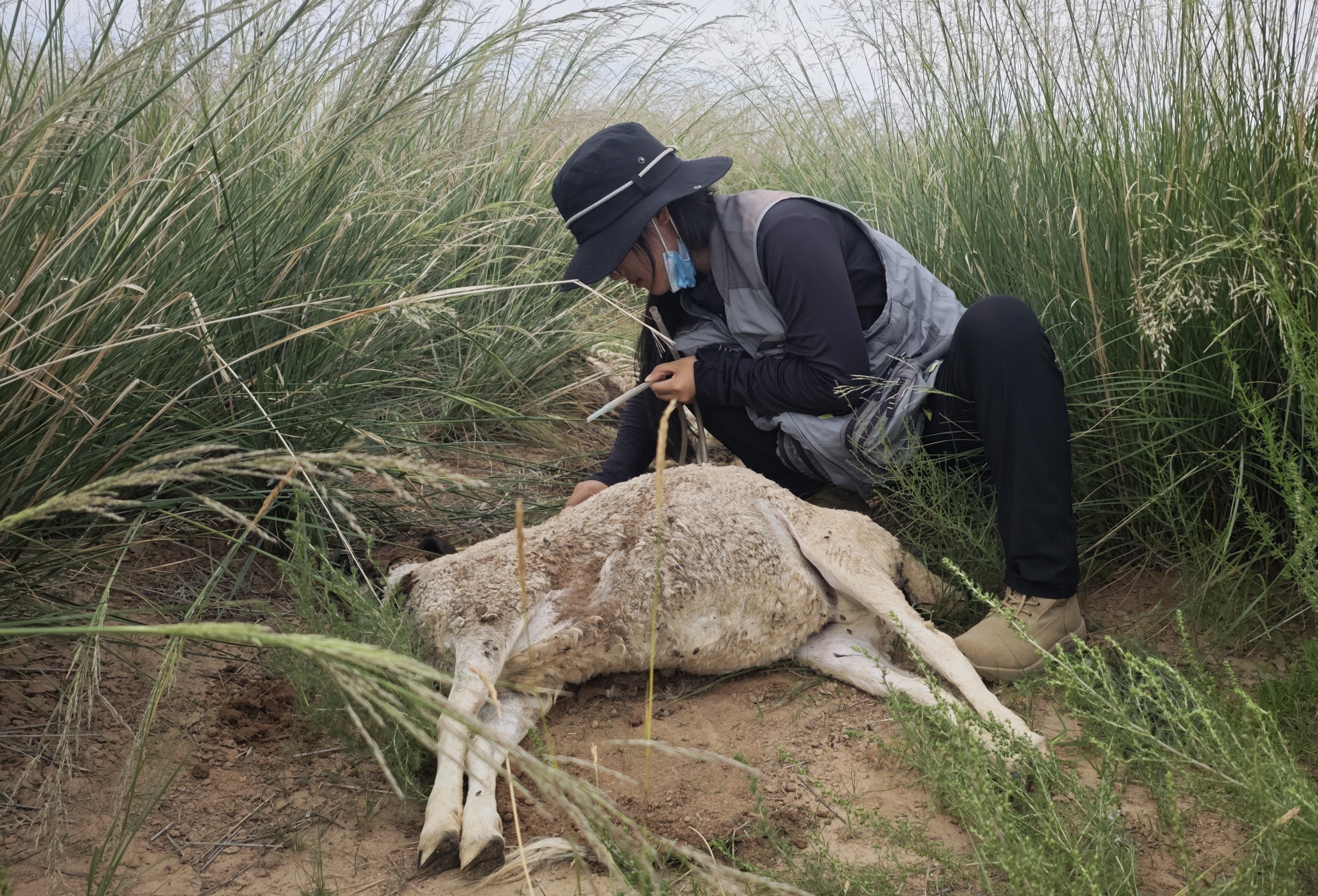 队员们在草地和沙地上采集时,发现昆虫数量并不少,有草天牛、象甲、拟步甲等。我们还意外发现了三具羊尸体,这可真是个“宝藏”采集点!把尸体移开后,下面的各类昆虫四散奔逃,有葬甲、皮蠹虫、隐翅虫。专门采集隐翅虫的李洋同学乐坏了,立刻投入战斗。尸体和腐土散发着刺鼻的气味,令人难以呼吸(图12)。其他同学也纷纷帮助,采集到了许多平时难得一见的昆虫,打了一场漂亮的“胜仗”。
