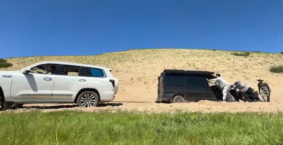 四野无人,附近唯有一个牧民借给我们拖车绳,却崩断两次,不得不再花很长路程返回恩格尔河,才借来一条钢丝绳,把JMC房车拖出(图25)。沙地环境里,BJ60表现出非凡越野动力,立了大功。接着三辆车返回恩格尔河,顺柏油路到巴彦淖尔镇,再去第六站——乌兰察布镇。