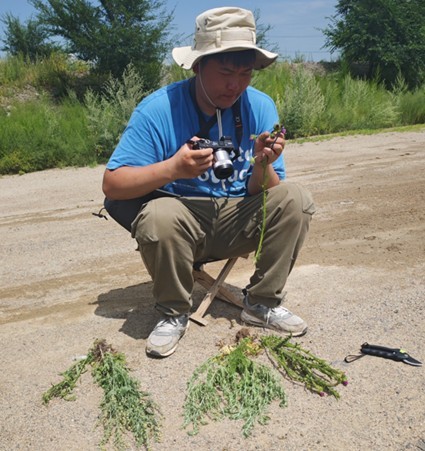 这里的蚜虫也多,肖苏洋丰收了——他只管坐在路上刷蚜虫,队员们一会儿就给他送来七八号蚜虫,肖苏洋坐享其成,喜上眉梢。他面前摆放着带蚜虫的植物,专注的神态俨然一位植物分类学者(图29)。