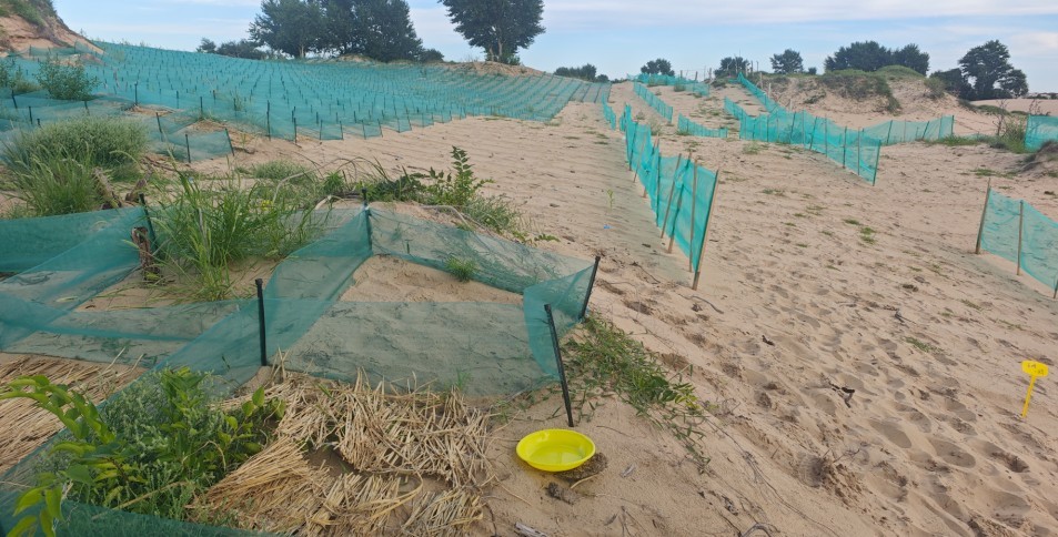 带着这个疑问,8月4日我们到了考察第十个点——库伦旗。一整天我们都在沙地周围采集,白天去了中国科学院的治沙基地,放置了黄盘(图36),还选了一个沙漠里的灯诱地点,这儿比奈曼旗地点的沙子更多(图37)。