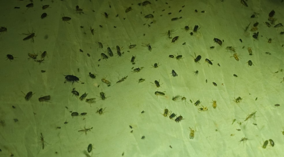晚上去阿巴嘎城区边灯诱,是个兴奋而又痛苦的过程——灯一开,步甲就来,围着灯诱幕布飞舞,我们拿起昆虫网挥舞着捉步甲。有的落到旁边杂草上休息,我就拿盆子接着,把叶子上的步甲振到盆子里,一会儿功夫就装满了两大瓶,足有上万只。地面上的来不及捡,踩死了不少。一个小时过后,步甲越来越多,爬到大家的衣服上、头发上、脖子里,甚感骚扰。继续采集已无必要,就撤灯回去休息了。