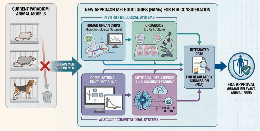 NAMs 包括人类器官芯片、类器官和计算方法,例如计算机模拟(in silico)PK/PD建模和人工智能(AI)的应用。目标是单独和组合使用这些方法,逐步替代药物监管审批过程中的动物试验。