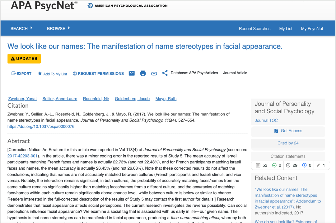 [1] Zwebner Y, Sellier AL, Rosenfeld N, Goldenberg J, Mayo R. We look like our names: The manifestation of name stereotypes in facial appearance. J Pers Soc Psychol. 2017 Apr;112(4):527-554. doi: 10.1037/pspa0000076. Epub 2017 Feb 27. PMID: 28240942.