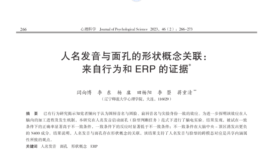[3] 闫向博,李东,杨廙,等.人名发音与面孔的形状概念关联:来自行为和ERP的证据[J].心理科学,2023,46(02):266-273.DOI:10.16719/j.cnki.1671-6981.20230202.