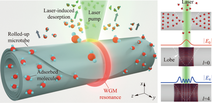 理解水分子与固体表面的相互作用(如吸附、解吸)是表面科学、生物物理和催化等领域的核心问题。传统研究多关注于外部温度变化介导的吸附行为,而光照射(如激光)对分子解吸动力学的影响尚不明确。尤其是亚单层水平的水分子解吸过程,其光学检测仍具挑战性。回音壁模式(Whispering-Gallery-Mode, WGM)微腔因其高灵敏度已被用于分子传感,但传统WGM多局限于二维平面,难以实现空间分辨的动力学测量。