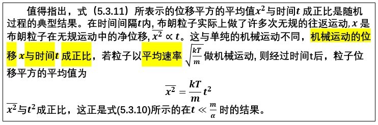 这段话强调的是“布朗粒子实际上做了许多次无规的往返运动”,因此研究的是位移平方的平均值。但对于做机械运动的粒子,如果速度是常数,例如平均速率,其位移x就和时间成t正比。后面对机械运动粒子用位移平方的表达式,我认为是不对的,因为“单纯的机械运动”是确定性的(有规)。不存在平均的问题。