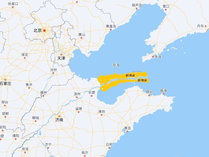 很多人担心黄海携带的泥沙把渤海填平,影响渤海内部的港口运行,实际上可以通过入海口的引导,把黄河引出渤海,如图黄色区,这样沿渤海各个港口都不会受到影响,而且把渤海内的部分岛屿与陆地进行了连接。