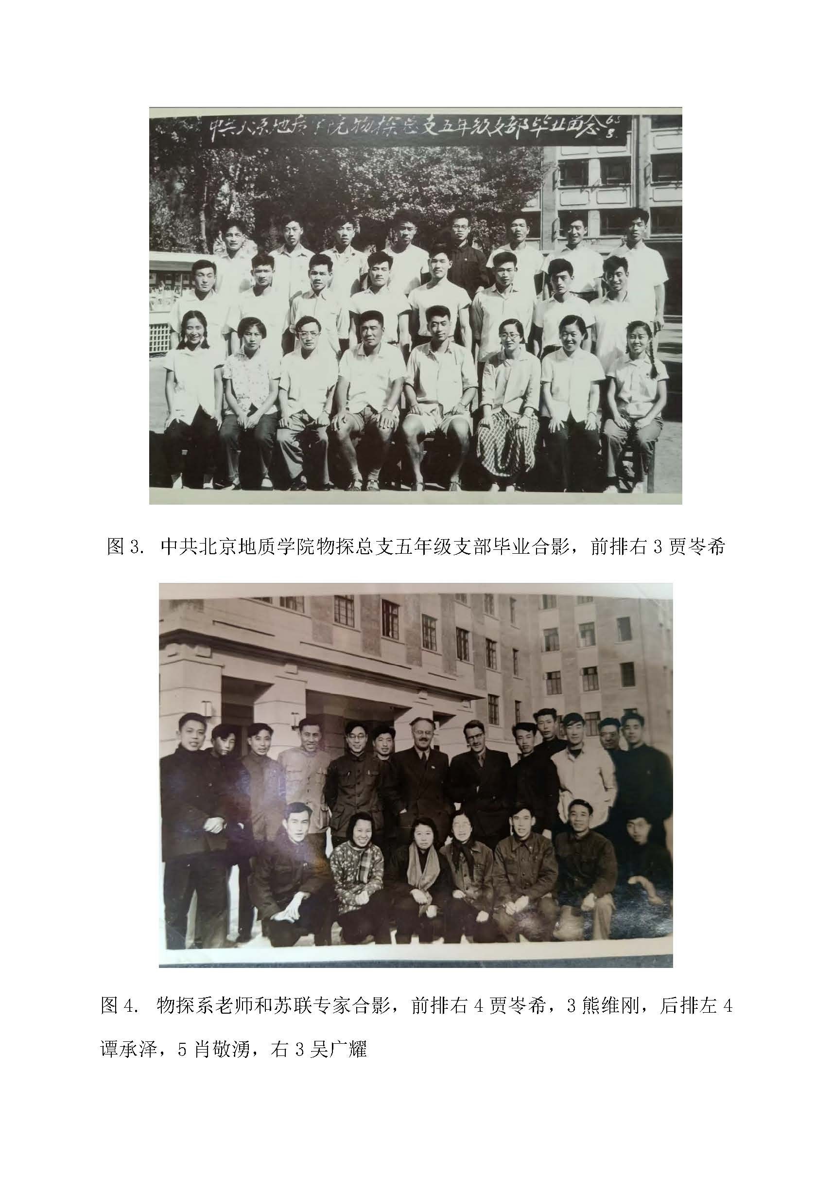 贾苓希书记1948年参加革命,同年十二月加入中国共产党。新中国成立后,国家为了培养各行各业建设人才,选派有一定文化基础的优秀干部去大学学习。为此,1952年贾苓希书记以调干生身份入学北京地质学院地球物理勘探系学习,并担任党支部工作。1955年提前毕业,就读苏联电法勘探专家研究生。1957年研究生毕业留校,主要在物探系党总支工作(图2,3,4)。1975年学校整体迁往武汉办学,贾苓希老师出任武汉地质学院物探糸首任党总支书记,1995年离休回北京定居(图5,6,7)。