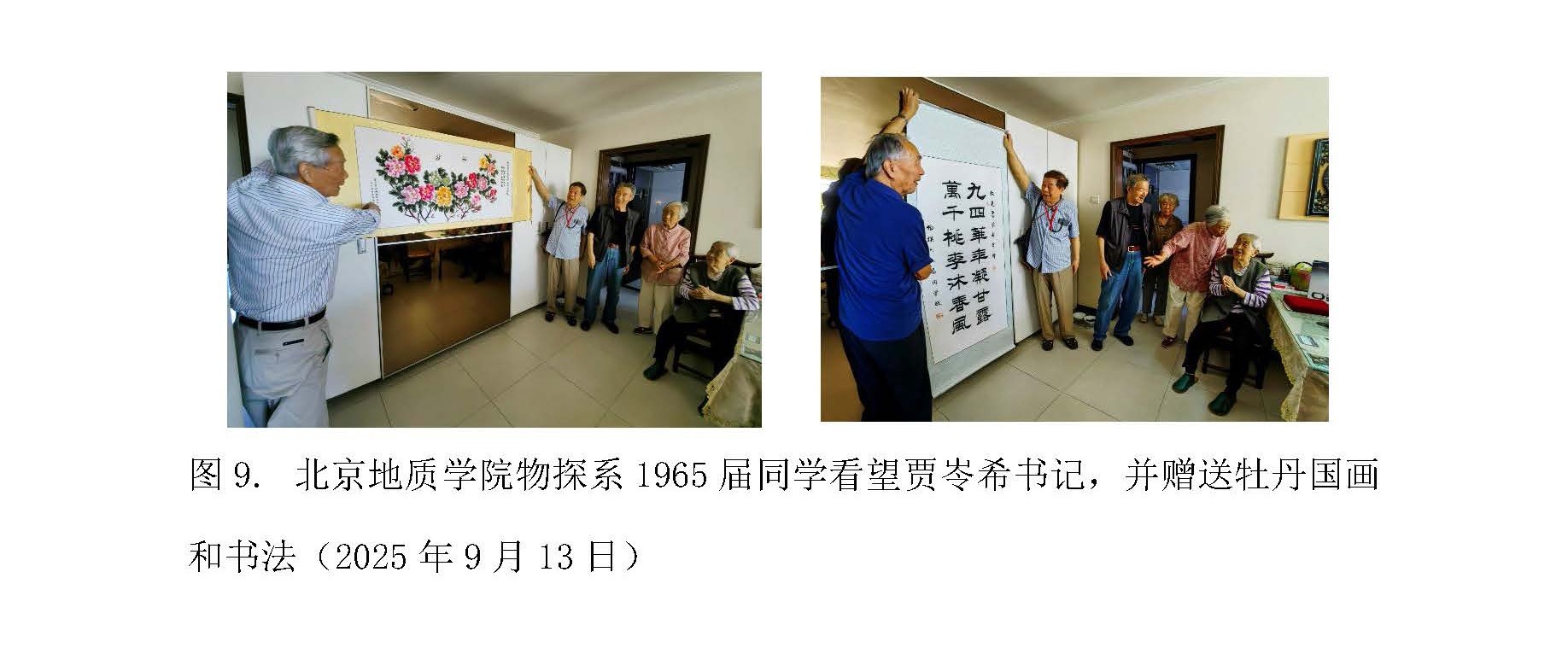 2025年9月13日原北京地质学院物探系1965届部分同学在北京母校聚会,纪念大学毕业60周年,这些如今已界耄耋之年的校友始终怀念母校的培育之恩。为此,在聚会期间同学们专程去看望了贾苓希书记,并赠送一幅四尺軸裱的牡丹国画和一幅“九四华年凝甘露,万千桃李沐春风”书法,表达对贾书记的敬仰之情(图9)。