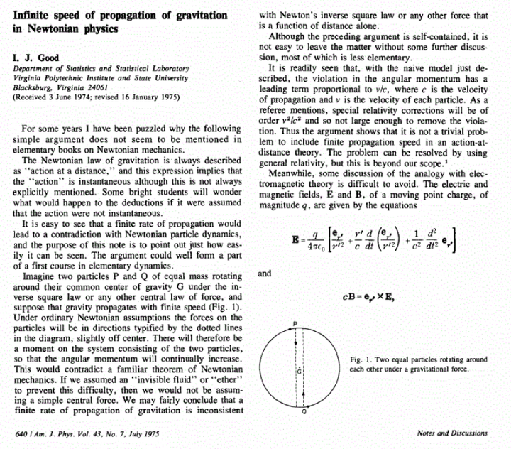 I. J. Good的论文蛮有趣,他假设这个传播速度是有限的。这个时候,他考虑两个物体,它们绕着圆心转动,那么由于传播速度有限,这个力的方向就会偏离圆心,这样,两个物体在力的作用下,角动量将不再守恒,而是速度(和角动量)会越来越大。速度增大,离心力增大,距离将增加。显然,这个不断增大的速度的直接后果是,这个体系将不再稳定,而是会随着时间的演化越来越大,最终解体。我们甚至可以期待,宇宙将不再稳定。这是一个灾难。所以,这个有限的速度将和万有引力定律不一致。