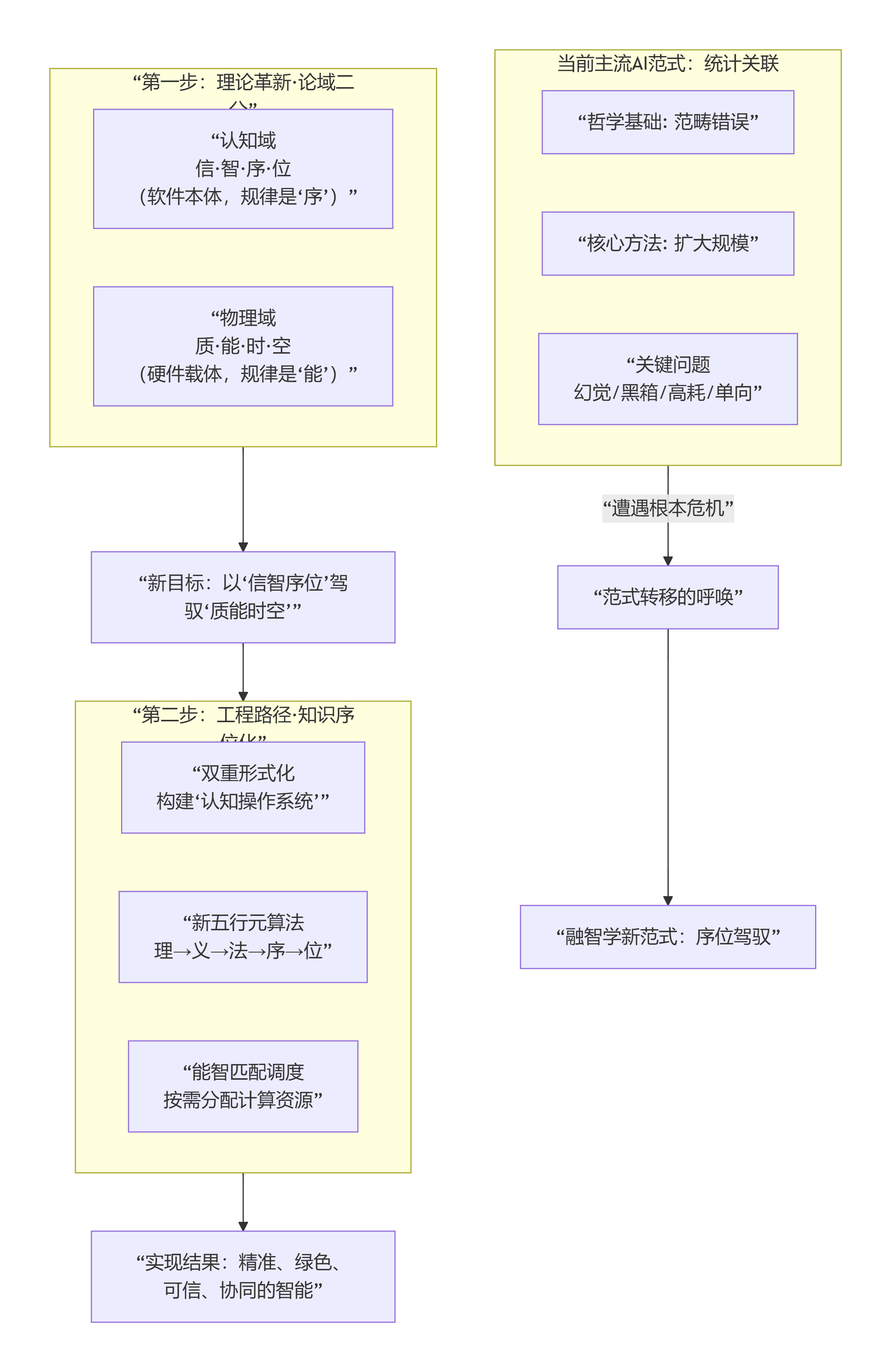 6. 结论当前以规模竞赛为核心的AI发展路径已触及物理与认知的天花板。融智学范式通过严格的论域二分,将“智”从“能”绑架中解放出来;通过双重形式化,为“智”建立了可计算、可操作的工程基础;通过动态调度与能智匹配,实现绿色、普惠的高效之智。这条以 “知识的序位化” 为核心的路径,不仅是对现有范式的深刻批判与补充,更是迈向真正通用之智、实现人机文明共生的关键一步。它预示着一个新的能智二分的研究论域的开启:在那里,机器之智不再是神秘的黑箱与能耗的巨兽,而是人类智慧可精准驾驭、并与之共同进化的忠实伙伴。