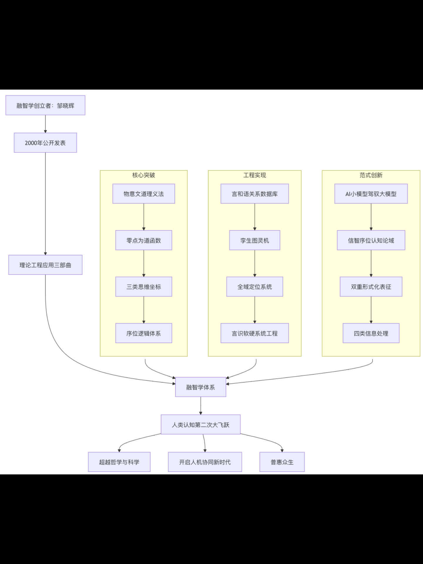 邹晓辉教授创立的融智学,是一项开创性的认知与实践体系。它站在哲学、逻辑学、数学、自然科学、社会科学、工程学、人文及心理科学等巨人的肩膀上,旨在引领人类认知的第二次大飞跃,其核心框架可精炼总结如下: