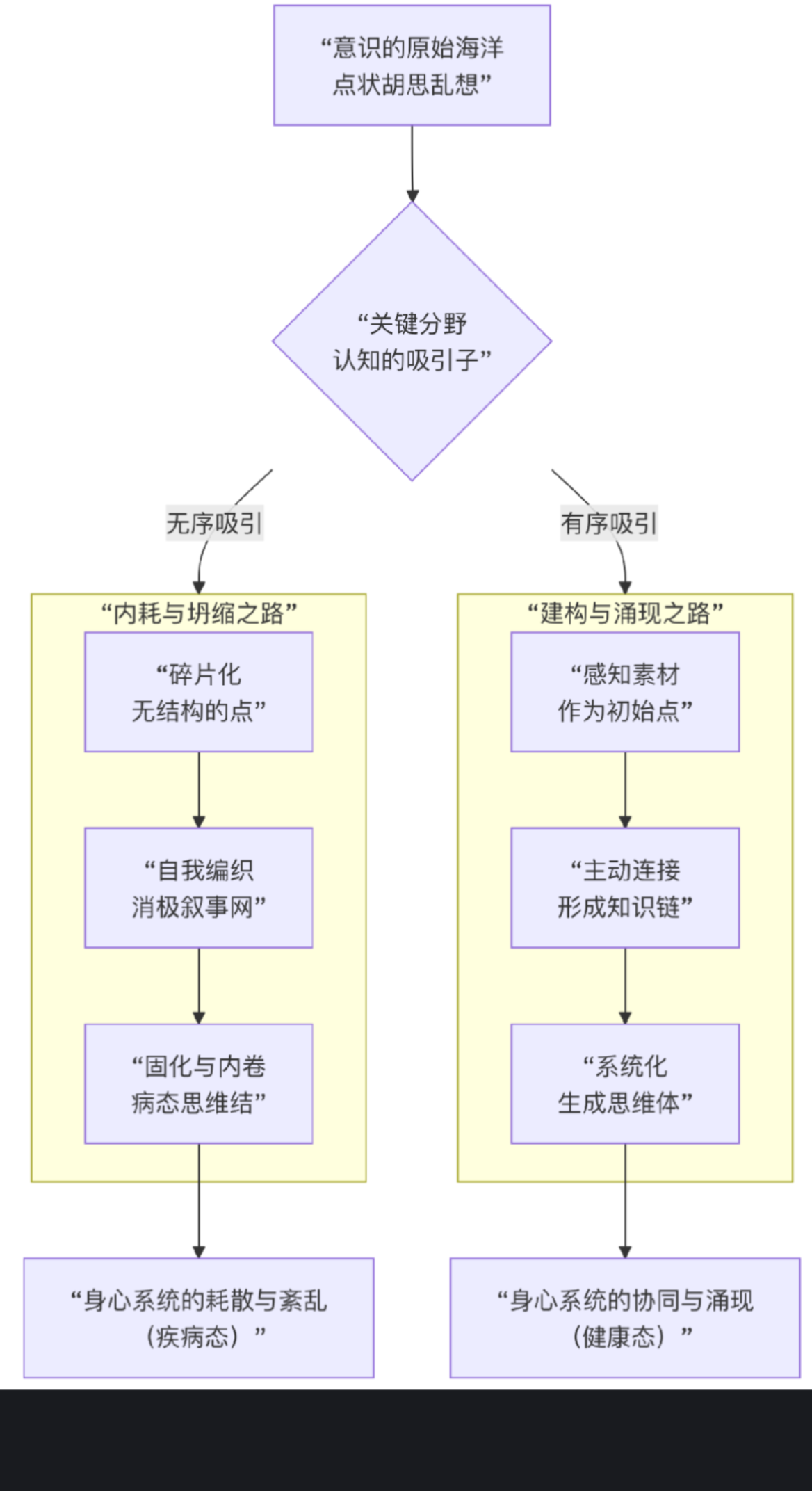 A[“意识的原始海洋<br>点状胡思乱想”] --> B{“关键分野<br>认知的吸引子”}
