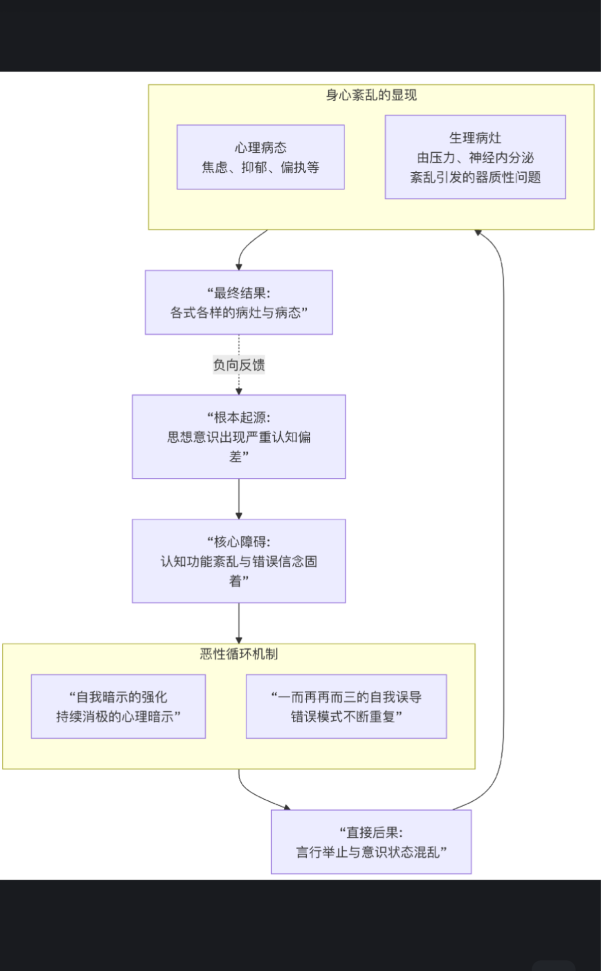 1. 认知为因,身心为果:您的观点强调了“心”的主导性。持续的错误认知(如极端化、灾难化思维)会引发持续的负面情绪(焦虑、愤怒),进而通过神经-内分泌-免疫系统(如长期皮质醇升高)导致生理功能失调,最终可能表现为具体的躯体疾病。