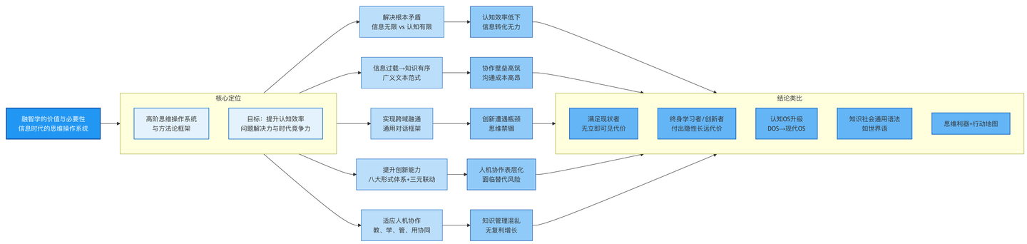 3. 时代诊断的共鸣:两者都立足于对信息时代困境(过载、碎片化、协同低效)和智能时代机遇(人机协作、知识工程)的深刻洞察。回应不是空谈理论,而是紧扣时代痛点,这证明了融智学的问题意识是精准且具有普遍性的。