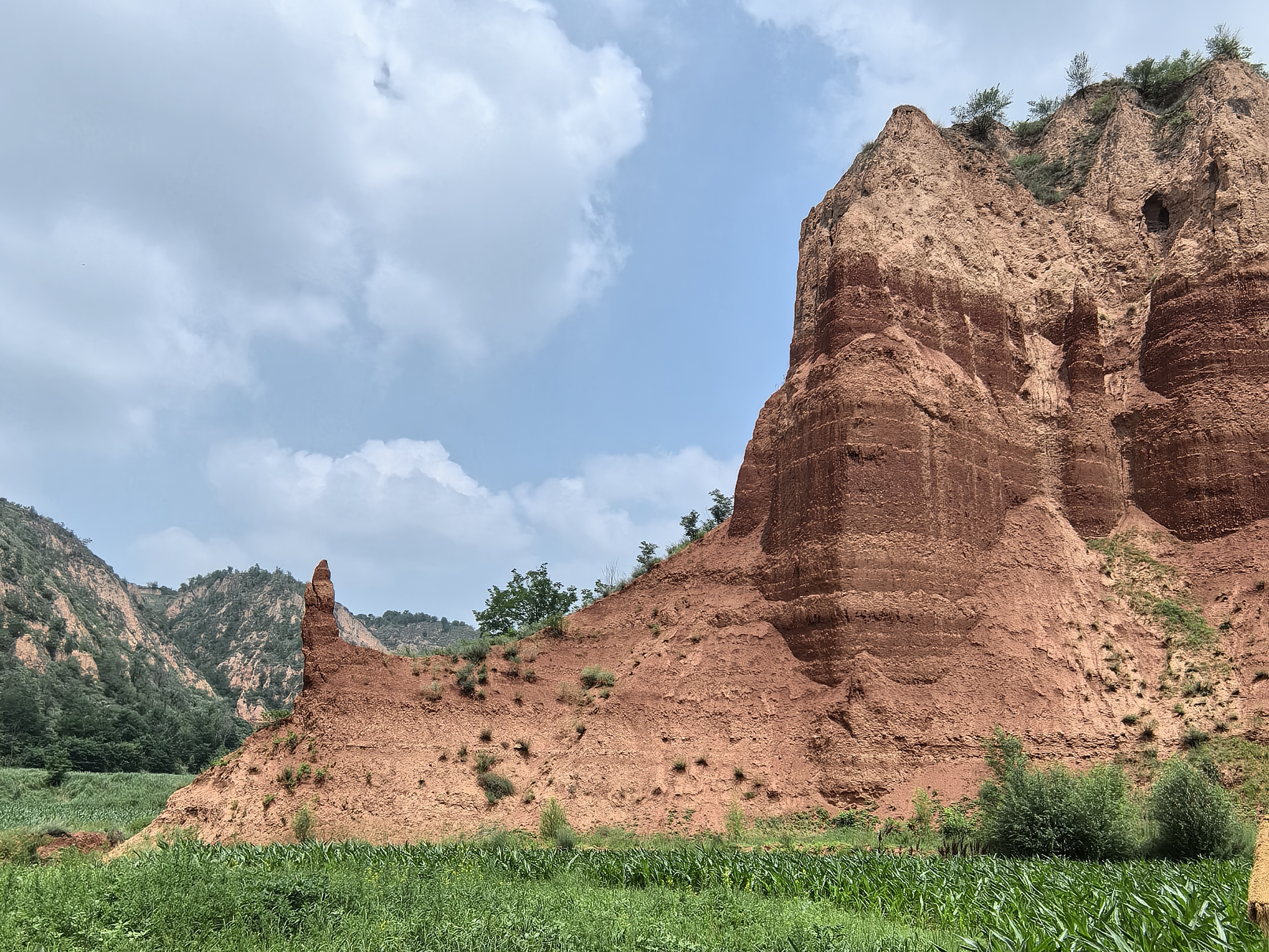 我们继续行驶,车轮转过的地方,风景不断变换。起初是茂密的阔叶林,杨树、槐树在绿意中透着夏天的勃勃生机生机;行至高处,植被渐稀,取而代之的是耐旱的松柏和灌木丛,山体岩石裸露,尽显太行的雄奇险峻。透过车窗望去,层峦叠嶂,沟壑纵横,梯田顺着山势层层向上,勾勒出优美的曲线。偶尔能看到山间的小村庄,红瓦白墙的房屋散落在山谷间,炊烟袅袅,鸡犬相闻,仿佛世外桃源。