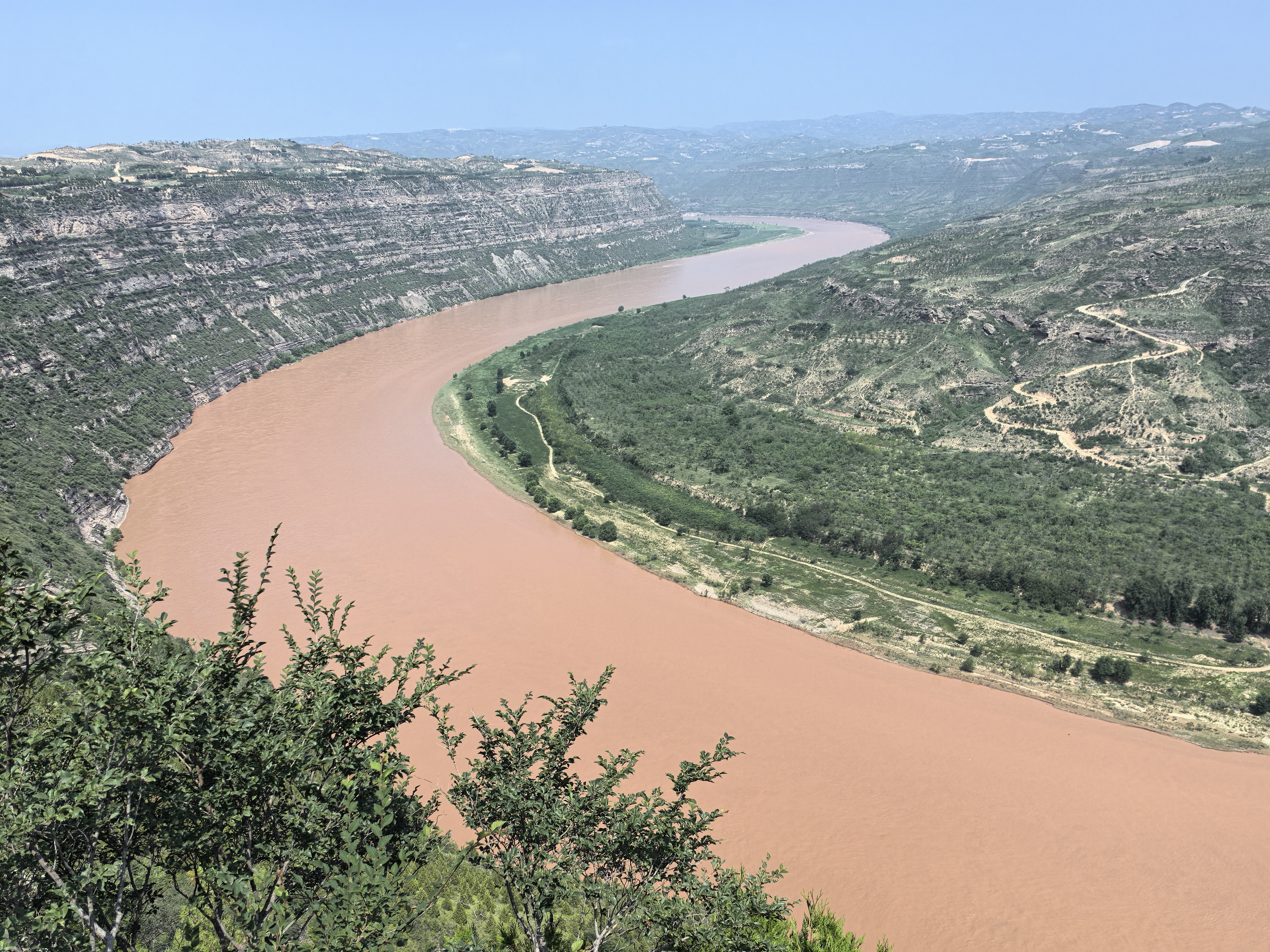 路上经过“东征”村,也有东征纪念馆。1936年,中国工农红军东渡黄河,进入山西境内作战,在永和留下了宝贵的史迹。行驶约半小时后,我们抵达乾坤湾地质公园。站在瞭望台上,眼前的景象令人震撼:黄河形成连续的巨大“S”形蛇曲,一共有七个湾,三叠系的岩层被切割得非常陡立,但其上没有晚中新世红土。两岸群山巍峨挺拔,黄河水奔腾不息,浑浊的河水带着黄土高原的厚重与沧桑,蜿蜒向前。灿烂的阳光洒在河面上,河水泛着金色的波浪,与两岸的绿树、黄土构成了一幅壮丽的画卷。我们去了地质公园内的博物馆,内容相当丰富,以地质知识为主,也有考古的文物,特别是一组青铜器异常精美。不过,博物馆也存在败笔,将巨型的山西山西鳄(Shansisuchus shansisuchus)的复原骨架说成是小型的桑壁永和鳄(Yonghesuchus sangbiensis)。