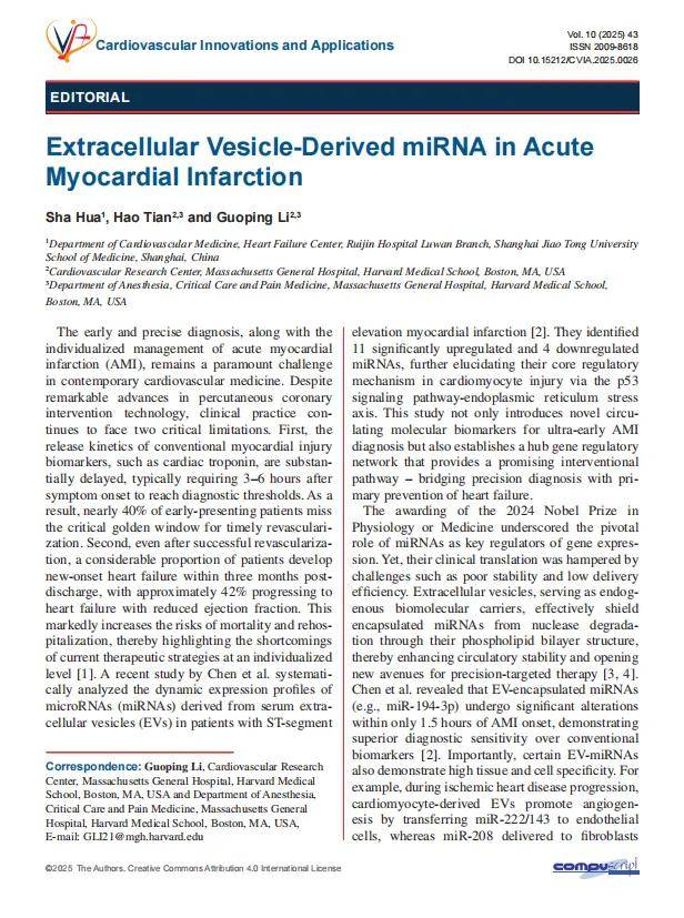 Hua S, Tian H, Li Gp. Extracellular Vesicle-Derived miRNA in Acute Myocardial Infarction. Cardiovascular Innovations and Applications 2025. Vol. 10(1). DOI: 10.15212/CVIA.2025.0026