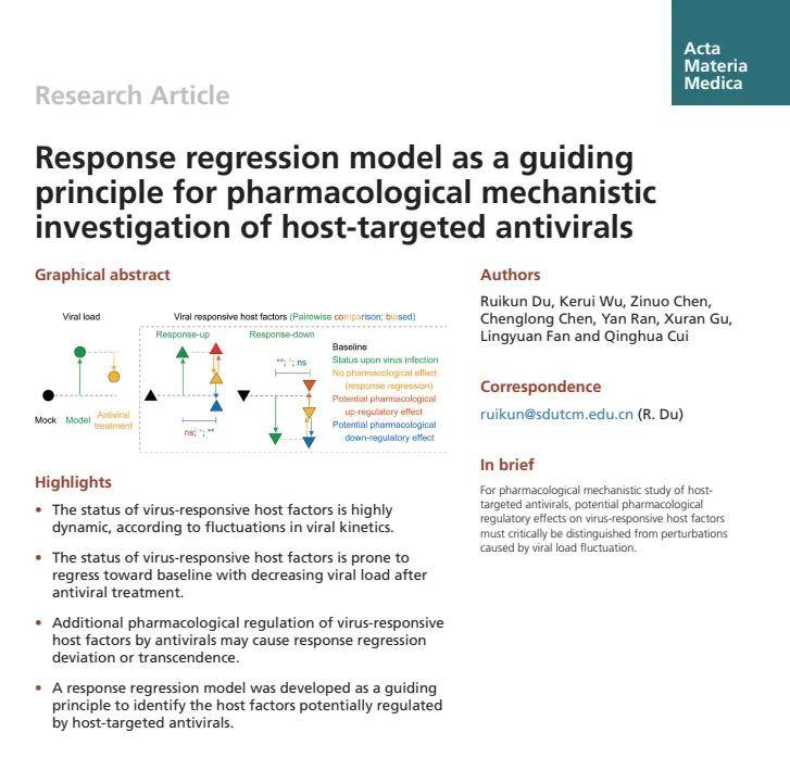近日,山东中医药大学杜瑞坤副教授在国际期刊Acta Materia Medica上发表了题为“Response regression model as a guiding principle for pharmacological mechanistic investigation of host-targeted antivirals”的研究论文。团队针对宿主靶向抗病毒药物机制研究的难点问题,即“病毒载量的动态变化对宿主应答水平的扰动效应”,提出一种“应答回归”模型作为抗病毒药物关键宿主靶点和药理机制解析的通用指导原则。