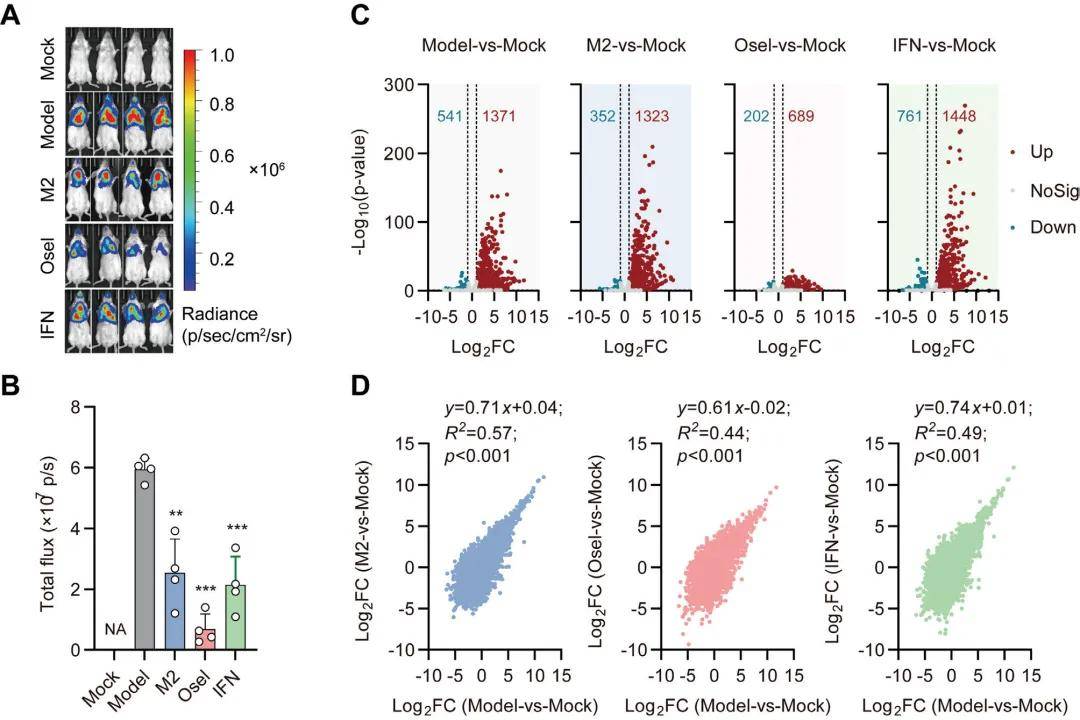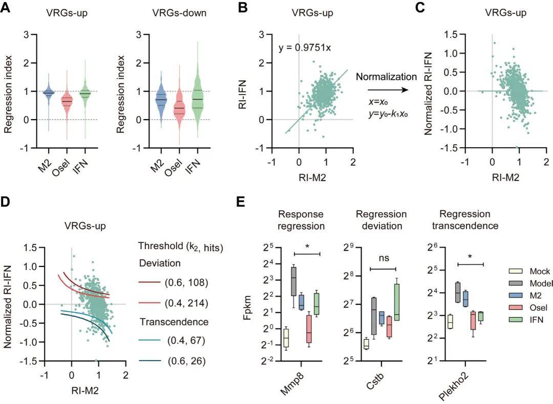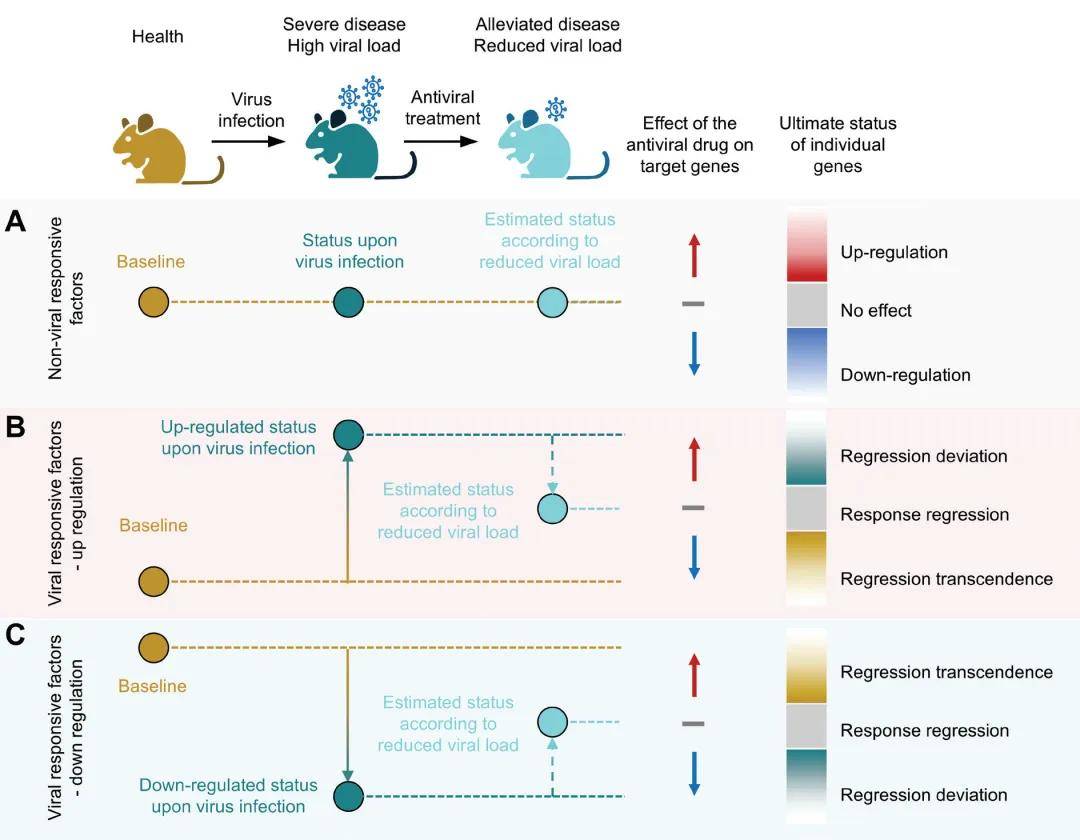 根据“应答回归”模型,团队提出抗病毒药物关键宿主靶点的鉴定策略:以宿主整体应答水平为锚点,预测宿主因子跟随病毒载量下降的应答回归理论状态,并与抗病毒药物干预的真实状态相比较;其中,真实状态相对理论状态表现应答回归“背离”或“超越”的宿主因子可能是药物干预的潜在靶点。进一步,团队以药物干预流感小鼠的肺组织转录组数据为基础,开发了一种新的分析算法,实现“应答回归背离/超越”宿主基因的高效挖掘。本研究对于抗病毒药物关键宿主靶点和药理机制的精准解析具有重要的指导意义。