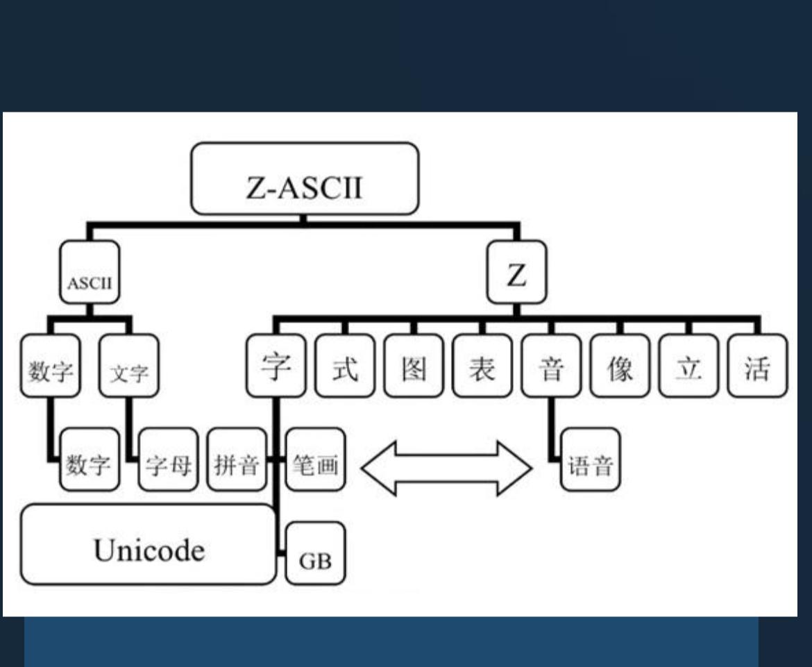· Z标准间接形式化:针对“言和语”及其复杂义项集群的语义,采用大字符集(汉字汉语)和八大形式体系,建立基于关联网络间接表征系统。此体系适合间接计算是人类理解的顶层语言。