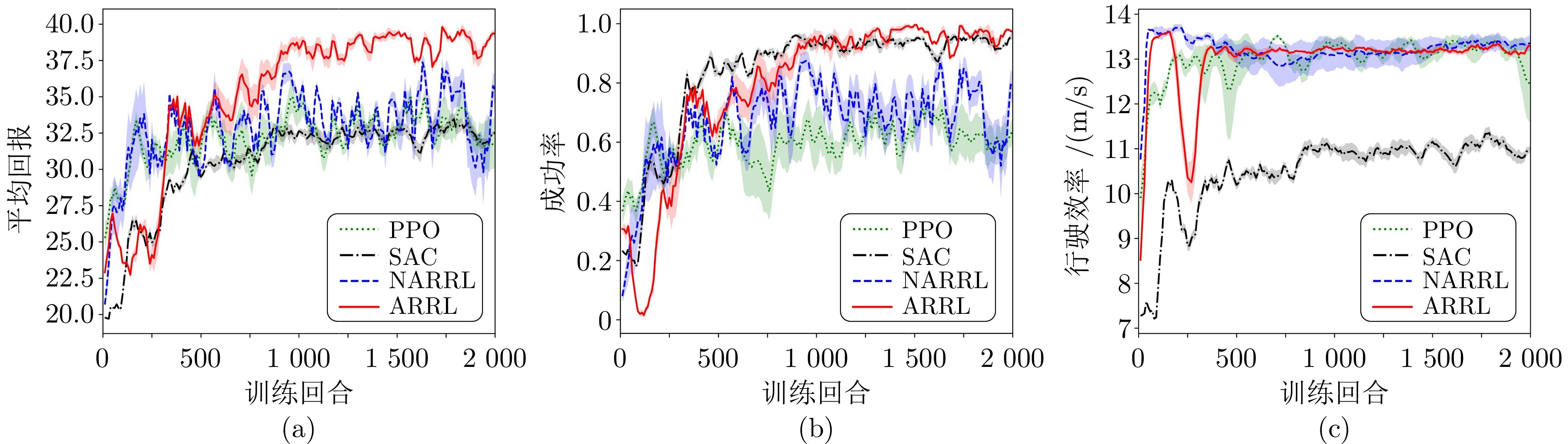 图3 不同强化学习方法训练的策略模型性能对比((a) ~ (c)分别展示各模型在平均回报、成功率及行驶效率方面的性能)
