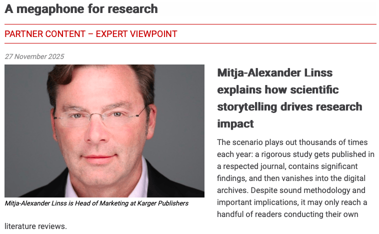 在学术成果数量激增的今天,研究的可见度已成为决定其社会影响力的关键因素。Karger出版社市场总监Mitja-Alexander Linss近日撰文指出,学术出版需从“传播末端”转向“全程赋能”,通过精准化的科学叙事打通研究成果与多元受众的壁垒。