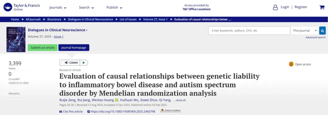 通过孟德尔随机化分析评估炎症性肠病的遗传易感性与孤独症谱系障碍之间的因果关系