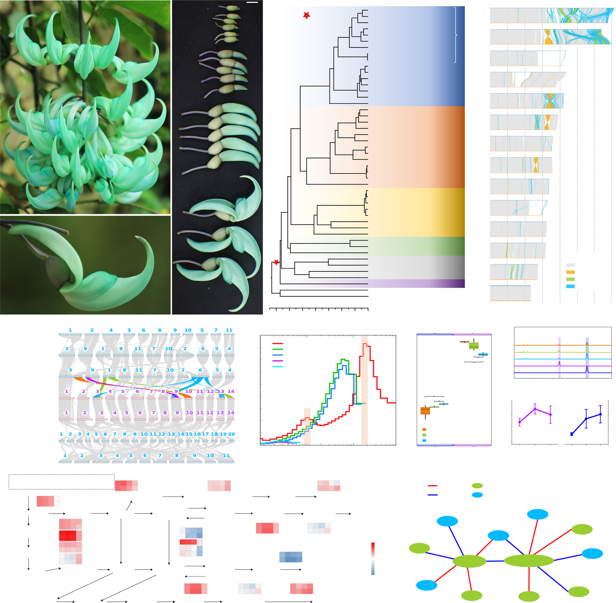 展示翡翠葛不同开花阶段的花部形态、系统发育关系、群体演化历史和蓝绿色花色相关的代谢与调控网络。图2A–D:开花四个阶段形态、豆科系统发育、单倍型结构变异、基因组共线性。图2E:基于PSMC的种群历史,显示两次关键扩张事件